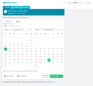 Da pokažemo kako radi ovaj sajt, za primer ćemo pretražiti avio karte Beograd – Bangkok i gledati karte u septembru jer nam je tad Skyscanner izbacio najpovoljnije karte.
